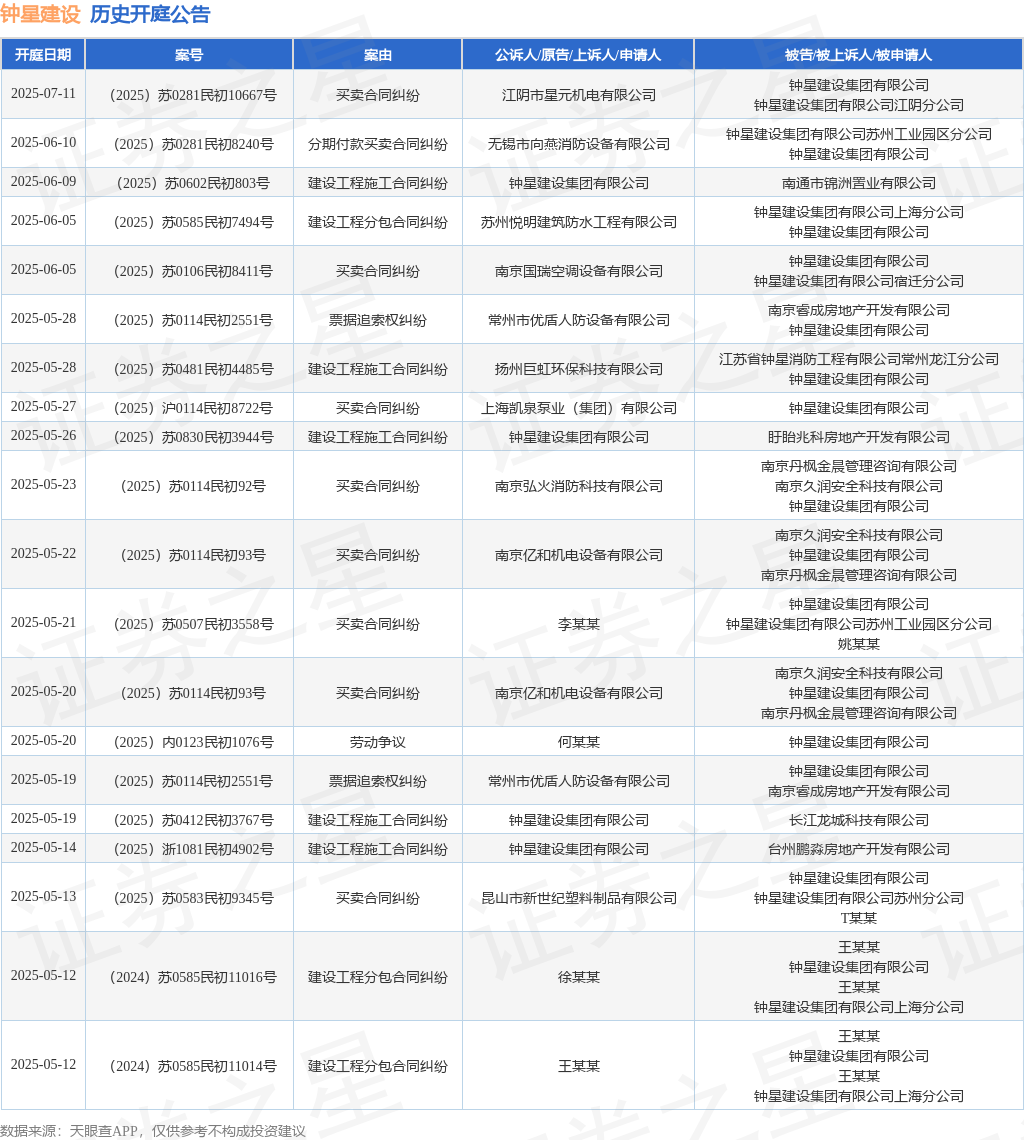 案号:(2025)浙1081民初4902号审理法院:温岭市人民法院案由:建设工程施工合同纠纷当事人信息: 原告/上诉人:钟星建设集团有限公司 被告/被上诉人:台州鹏淼房地产开发有限公司开庭日期:2025年5月14日根据统计,近一年内以钟星建设集团有限公司为当事人的历史开庭公告有215则,其中案由为“建设工程施工合同纠纷”的公告以63则居首,其次为“买卖合同纠纷”有38则,“劳务合同纠纷”有28则。历史开庭公告(前20条)如下: